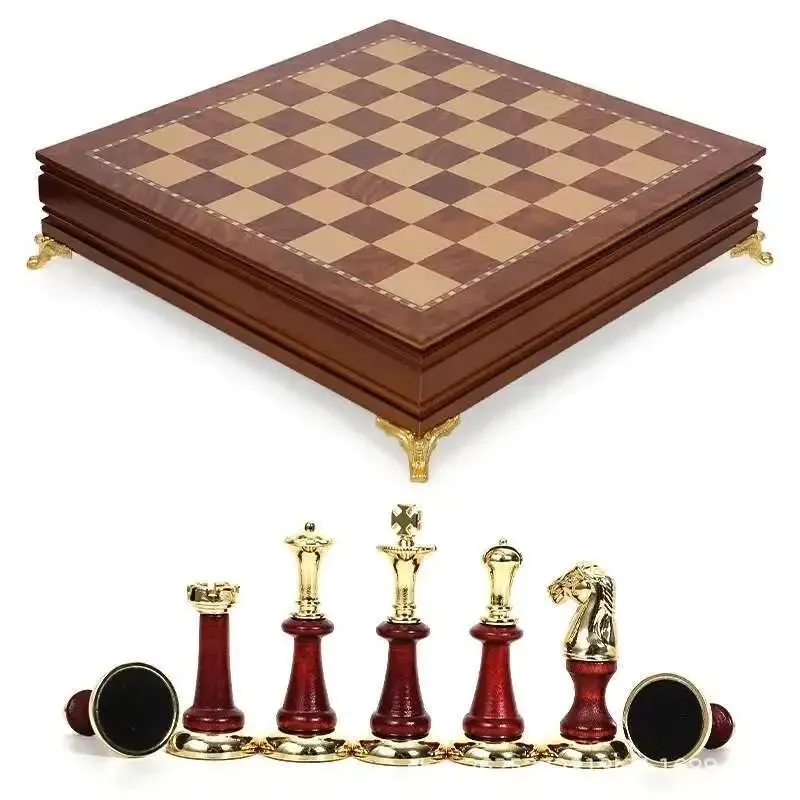 Échiquier Premium en Bois Massif 38cm – Plateau avec Tiroir Pièces d’Échecs Bois Métal 2 Dames de Rechange