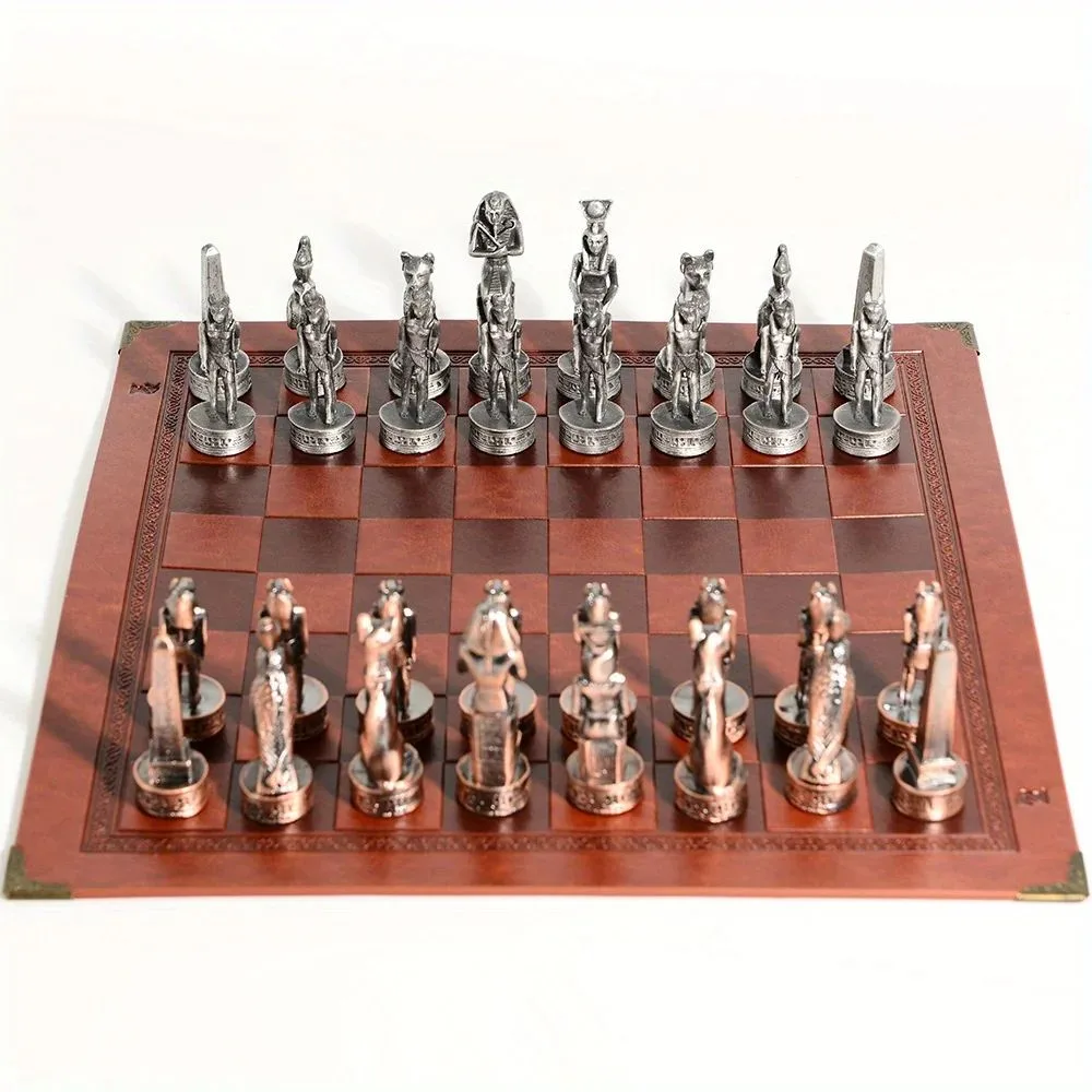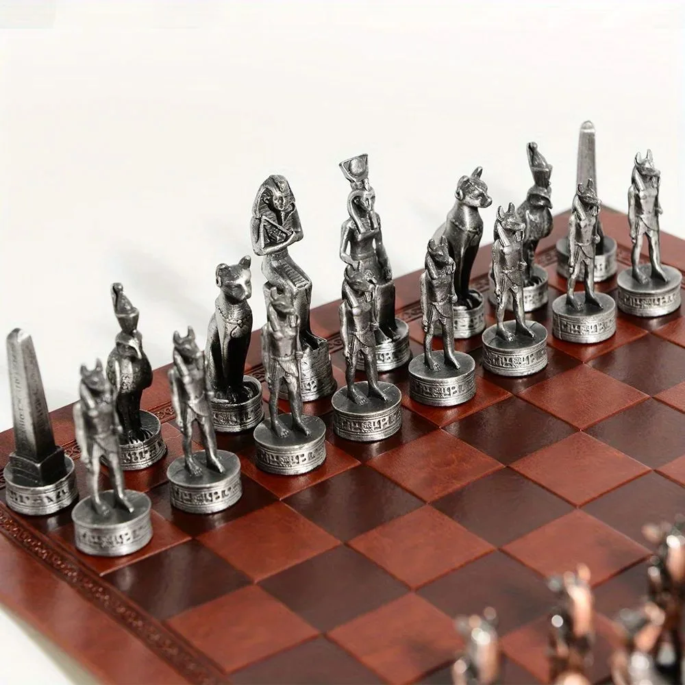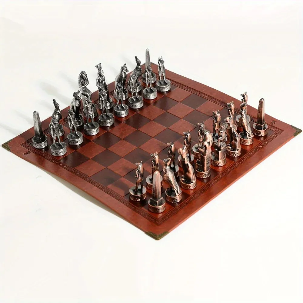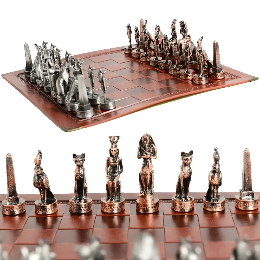 Profitez de notre Échiquier En Cuir Sur Le Thème De L’égypte Pièces D’échecs En Métal 32 Pièces