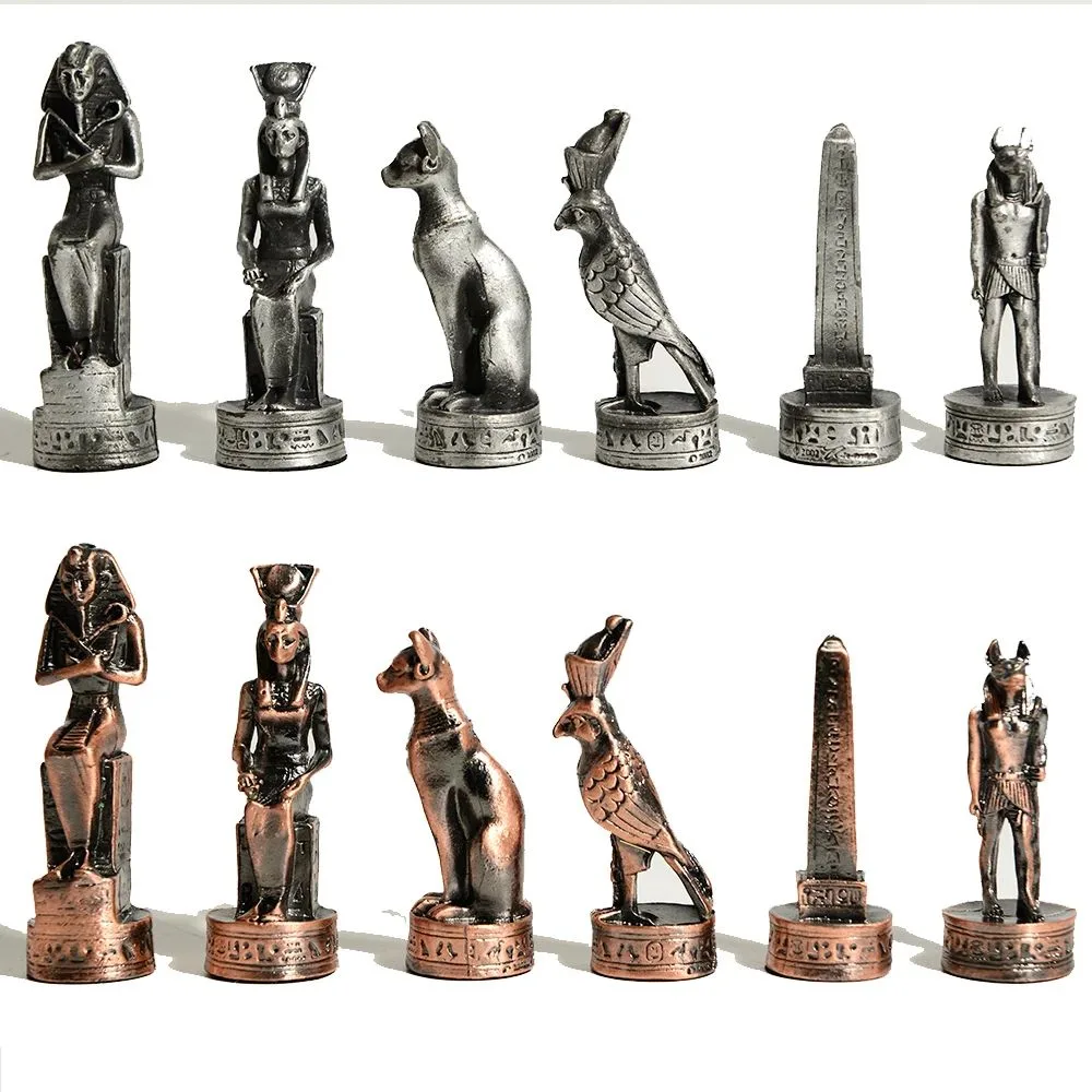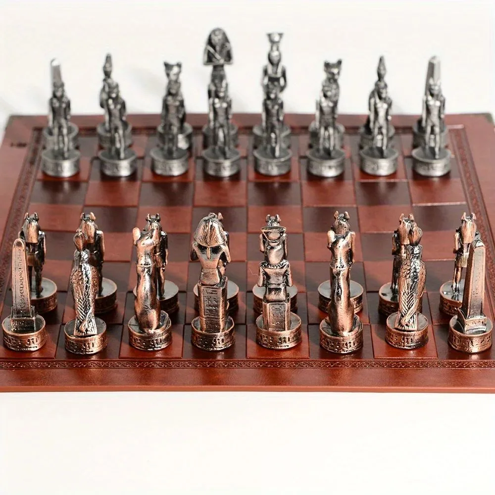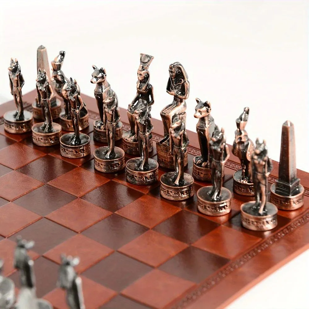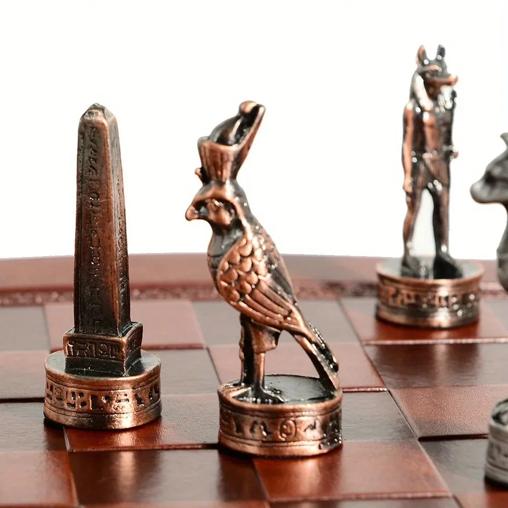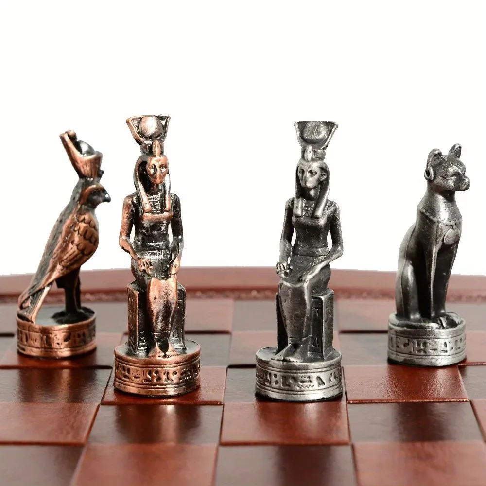 Profitez de notre Échiquier En Cuir Sur Le Thème De L’égypte Pièces D’échecs En Métal 32 Pièces
