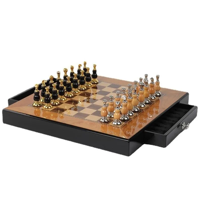 Les pièces d’échecs modernes séduisent par leur silhouette contemporaine et leur finition contrastée, créant une lecture visuelle rapide tout en conservant un rendu luxueux. Leur aspect métallique apporte une sensation de qualité au toucher et sublime chaque déplacement. Ce choix esthétique équilibre l’élégance entre le plateau et les pièces, enrichissant l’expérience de jeu tout en ajoutant à la beauté de cet échiquier en bois et métal.