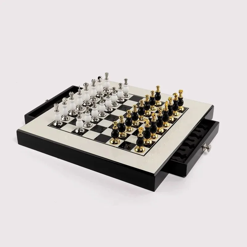 Un objet qui transforme une table ou une étagère en point focal : cet échiquier de luxe marie l’éclat des pièces métalliques et la chaleur du plateau en bois pour une présence déco immédiate. Sa finition soignée et ses formes contemporaines attirent le regard et apportent une touche haut de gamme à un salon, un bureau ou une salle de jeux. Cet échiquier décoratif est parfait pour ceux qui cherchent un élément décoratif utile autant qu’esthétique, offrant une harmonie entre fonctionnalité et style.